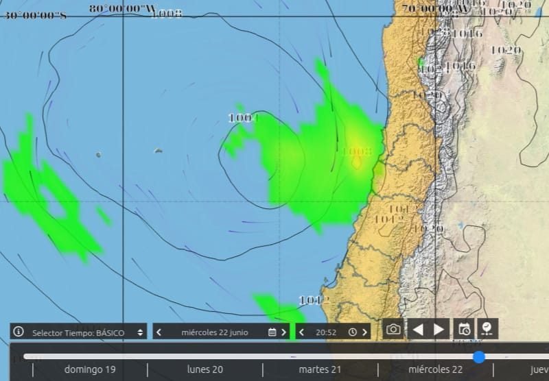 El profesor de la PUCV indicó que de acuerdo con el Geoportal Geoos de la Fundación Huinay “se trata de un sistema frontal que debido al bloqueo de una alta presión bastante intensa sobre el océano frente a la zona austral del país, aprovechó un corredor al norte de ésta y se deslaza a la zona central”.